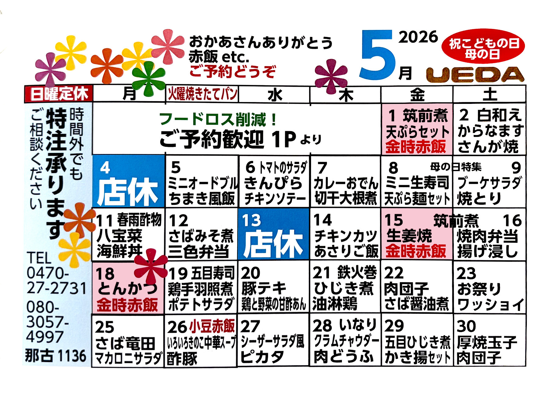 | 5月18日(月) | 【臨時】金時赤飯 販売します! |